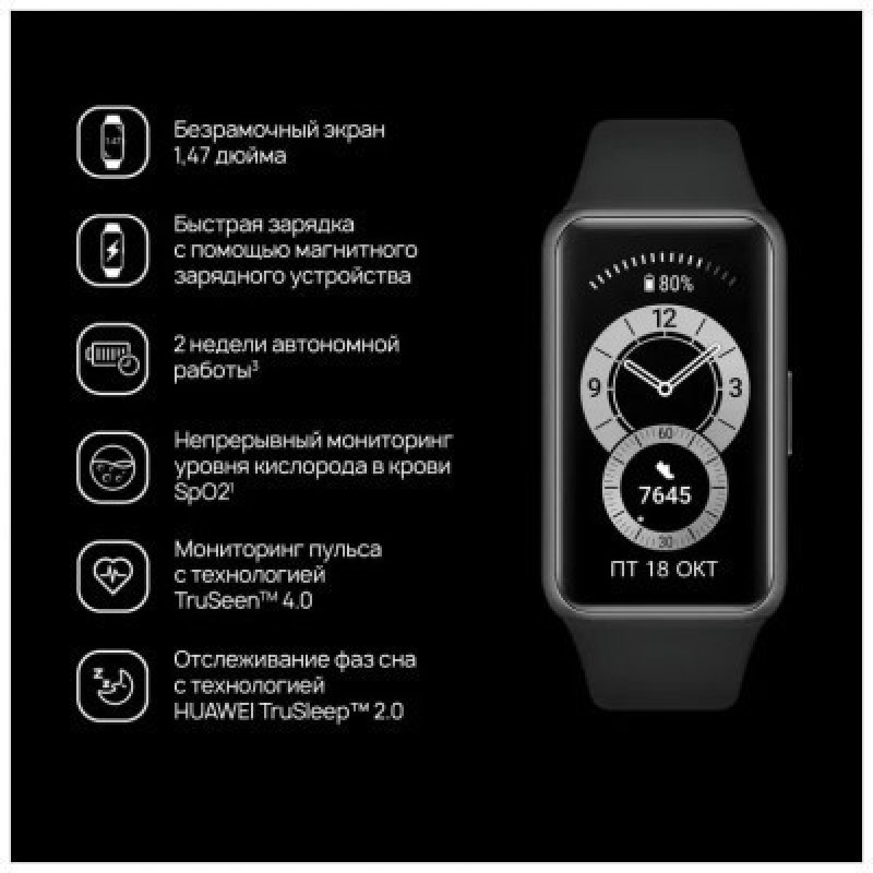 HUAWEI представляет вам поистине масштабное обновление часов серии Band. Большой и яркий экран, набор датчиков здоровья и фитнеса, продолжительная автономность и многое другое к вашим услугам от нового личного гаджета - браслета HUAWEI Band 6.Не всматривайтесь, а просматривайте. AMOLED-экран с диагональю 1,47″ и разрешением 198x368 не может не радовать глаз. С ним вам точно не придётся лишний раз напрягать зрение, чтобы увидеть важную информацию или прочитать уведомление. А внешнее олеофобное жироотталкивающее покрытие всегда сохранит его опрятный вид, стремительно удаляя следы от пальцев.Готовьтесь - в браслете Huawei Band 6 присутствует целых 96 режимов разных тренировок. Достаточно лишь нажать на кнопку «Виджеты» и отметить галочками те тренировки, которые вам нужны: от ходьбы, бега и плавания до танца живота, тайцзы и даже воздушного змея.В Huawei Band 6 также стоит отметить технологии круглосуточного измерения пульса TruSeen 4.0, качества ночного сна и уровня стресса, а также новый замер степени насыщения крови кислородом в режиме реального времени - SpO2. С ними вы сможете делать различные измерения и быть более внимательным к своему здоровью.Браслет Huawei Band 6 способен «протянуть» на целых 14 дней работы в режиме «стандартного использования» и 10 дней - в режиме «интенсивного использования». При необходимости его всегда можно стремительно зарядить всего за полчаса, чтобы потом активно использовать их целую неделю и больше.